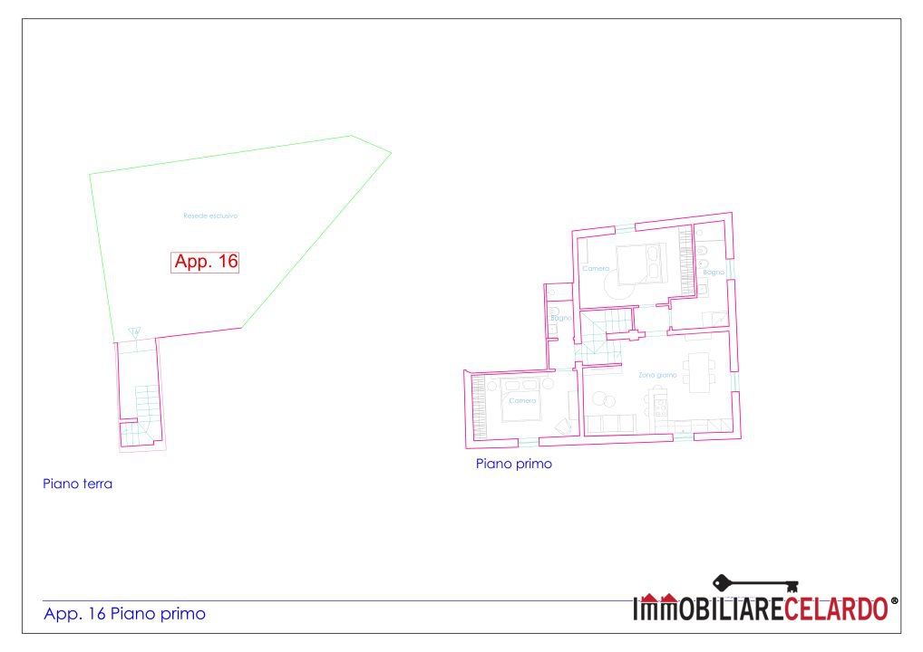 tramite ingresso al piano terra da resede esclusivo di mq 80 si accede al primo piano dove troviamo soggiorno/ cucina, due camere e due bagni.