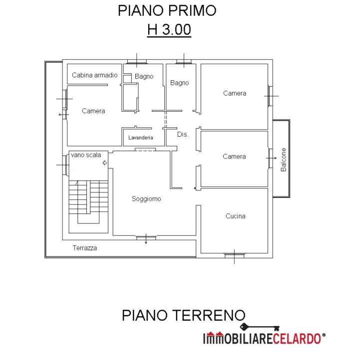al piano primo ampio soggiorno, cucina abitabile, tre camere (una delle quali dotata di cabina armadio), due bagni, lavanderia e due terrazze per un totale di mq 29 (una di mq 24 e una di mq 5).
