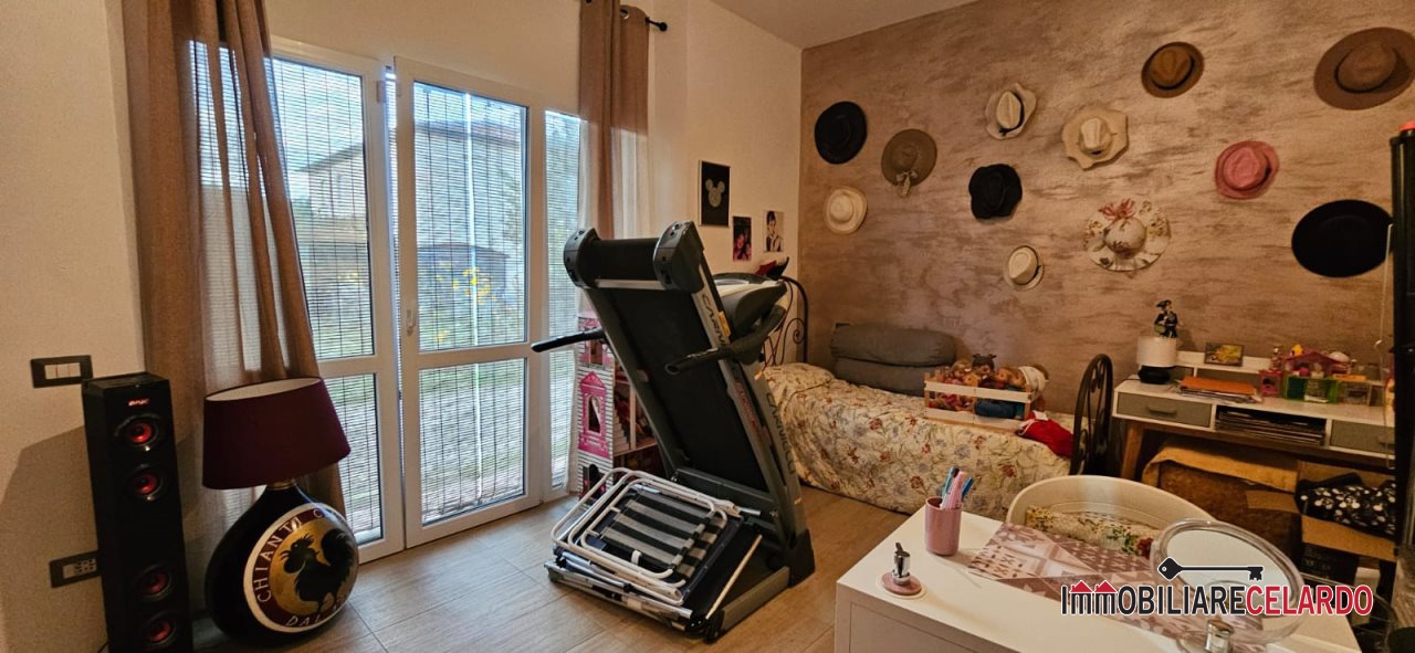al piano terra soggiorno/cucina, camera, bagno, lavanderia e due giardini per un totale di mq 170.